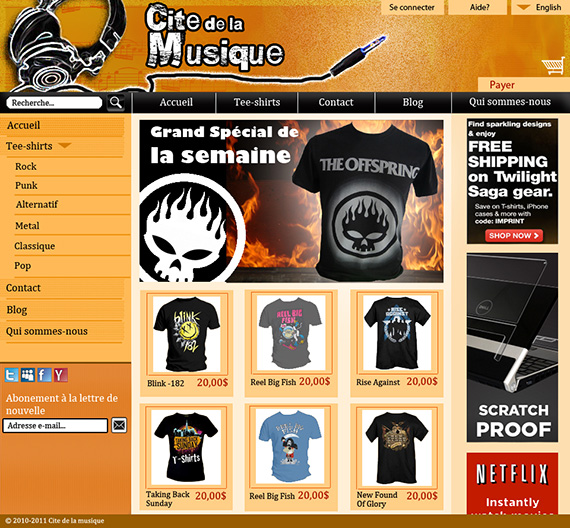 Cité de la musique Design pour un site de vente de chandail et autre vêtement en ligne sur le thème de la musique. Exercice réalisé dans le cadre d'un cours de Design