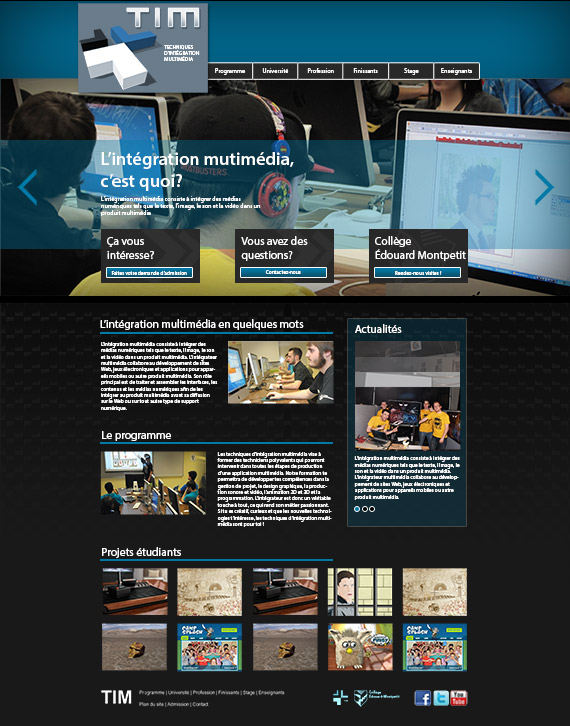 Dectim Refonte du site de la technique d'intégration multimédia du cégep Édouard Monpetit. Le projet a été fait dans le cadre des cours de production multimédia de 5ème sessionIntégration faites avec Jonatan Soulières sur Wordpress.